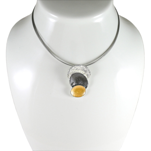ADELE, Stunning statement necklace. Its a three tone pendant, made with a unique technique of plating, has three layers of plating: Shiny & Matte silver, oxidized silver, matte gold and a third layer that keeps it from changing color or tarnishing, set with Austrian crystal. The necklace is made out of 8 stainless steel strings gray silicone coated, both comes together to a perfect WOW look. The necklace can be wear for daily casual or with a dressy outfit.