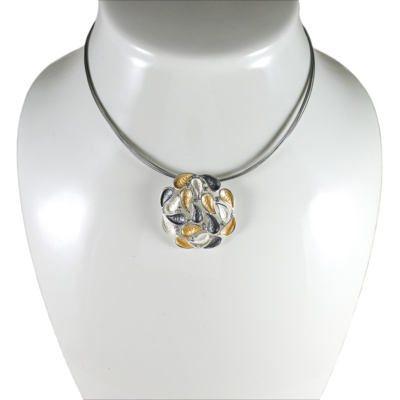 ALEXA, a unique necklace design, two tone effect, made with a unique technique of plating, has three layers of plating: Shiny & matte silver, matte gold and a third layer that keeps it from changing color or tarnishing, the necklace is made out of 8 stainless steel strings gray silicone coated, both comes together to a perfect WOW look.