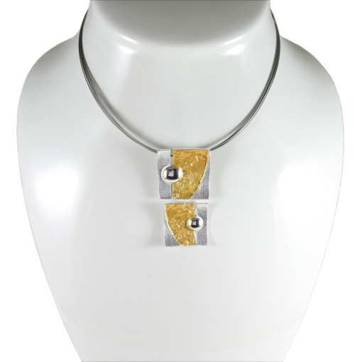 DALIA, a unique Necklace Design, 3 tone effect. The pendant is made of two parts shaped as squares and it is made with a unique technique of plating, has three layers of plating: Shiny & matte silver, oxidized silver, matte gold and a third layer that keeps it from changing color or tarnishing, the necklace is made out of 8 stainless steel strings coated with gray silicone, both comes together to a perfect WOW look.