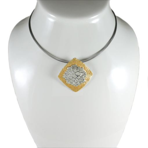 MARA, a unique necklace design, two-tone and a 3D effect. It is made with a unique technique of plating, has three layers of plating: Shiny & Matte silver, matte gold and a third layer that keeps it from changing color or tarnishing.