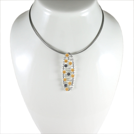 OLIVIA – Its a unique necklace design, 3 tone effect. The pendant is artistically shaped as a long drop. It is made with a unique technique of plating, has three layers of plating: Shiny & matte silver, oxidized silver, matte gold and a third layer that keeps it from changing color or tarnishing. The necklace is made out of 8 stainless steel strings coated with gray silicone, both comes together to a perfect WOW look.