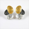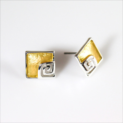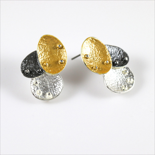 TAHTI are a stunning statement three tone stud earrings. The earrings are artistically shaped 3 geometric plates. They are made with a unique high quality plating technique. They have three layers of plating shiny and matte silver, oxidized silver, matte gold and a third layer that keeps it from changing color or tarnishing.